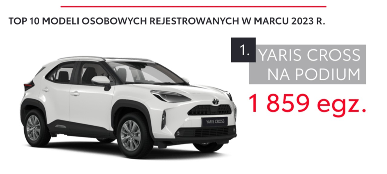 Pierwszy kwartał 2023 roku Toyota zakończyła jako lider polskiego rynku motoryzacyjnego. W tym czasie zarejestrowano 26 139 aut osobowych marki (ponad 2 razy więcej niż w przypadku marki zajmującej drugie miejsce w zestawieniu). Udział Toyoty w rynku samochodów osobowych wzrósł do 21,2% (+3,1 p.p. w porównaniu z analogicznym okresem 2022 roku).